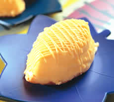 (5)將作法4擠入檸檬狀烤模內約7分滿,入烤箱以上火200C、下火16C烤約15 分鐘,可用手輕壓測試,若有彈性及紮實感即可出爐,將蛋糕脫模備用。